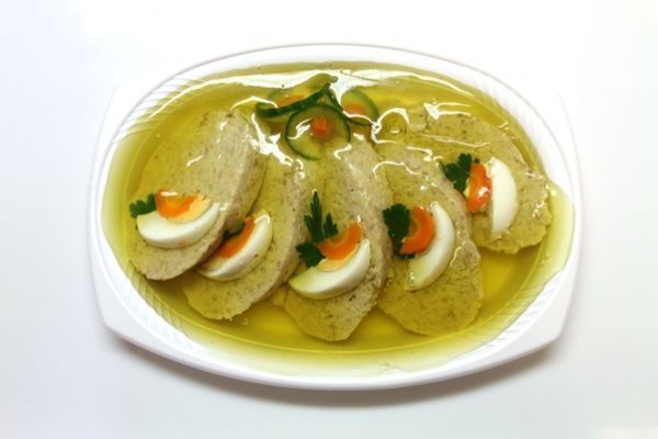 1. Щуку подготовить - отрезать плавники, хвост, голову (удалить жабры и глаза), помыть рыбу, снять с нее кожу. Отделить мясо от кости. 2. Желатин замачивают в небольшом количестве холодной воды. 3. Желательно оставить около 0,5 см. мяса на коже. 4. Голову (без глаз и жабр), позвоночник и ребра залить водой, добавить очищенные зелень и лавровый лист и варить 45 минут на слабом огне. Приправить солью и перцем (зёрна). По окончании, процедите отвар через сито. 5. Мясо щуки перемолоть три раза, и добавив немного соли, замесить с 1/2 стакана холодной воды. Добавить перемолотый батон, смоченный в молоке, и жареный в малом количестве оливкового масла лук., 6. Отделить желтки от яичного белка. Желток растереть с маслом, добавить в фарш, приправить солью и перцем. Взбейте один яичный белок в густую пену и присоедините к основной массе. 7. Один лист марли смочить в холодной воде, отжать, разложить на столе, смазать сливочным маслом. Выложить кожу рыбы, поверх фарш и сформировать цилиндр, а цилиндр обернуть в марлю.Обвязать только концы марли (наподобие конфеты) 8. Рыбу осторожно опустить в кастрюлю с бульоном, полученным от варки крстей и головы . Варить около 45 минут на очень слабом огне. По окончании варки осторожно вынуть рыбу, уложить на плоскую поверхность и охладить. 9. Для получения желе в 1 литр кипящего бульона положить предварительно замоченный в холодной воде, желатин, добавить 1 столовую ложку уксуса и на поверхность бульона выложить, взбитые в густую пену белки 2-х яиц (для осветления и прозрачности желе). Варить около 5 минут. Бульон профильтровать через марлю с ватой.). 10. Остывшую рыбу нарезать на пласты толщиной около 0,5 см., Уложить на блюде и залить рыбу бульоном. Перед заливкой можно декорировать овощами, лимоном, зеленью, морковью, яйцами.